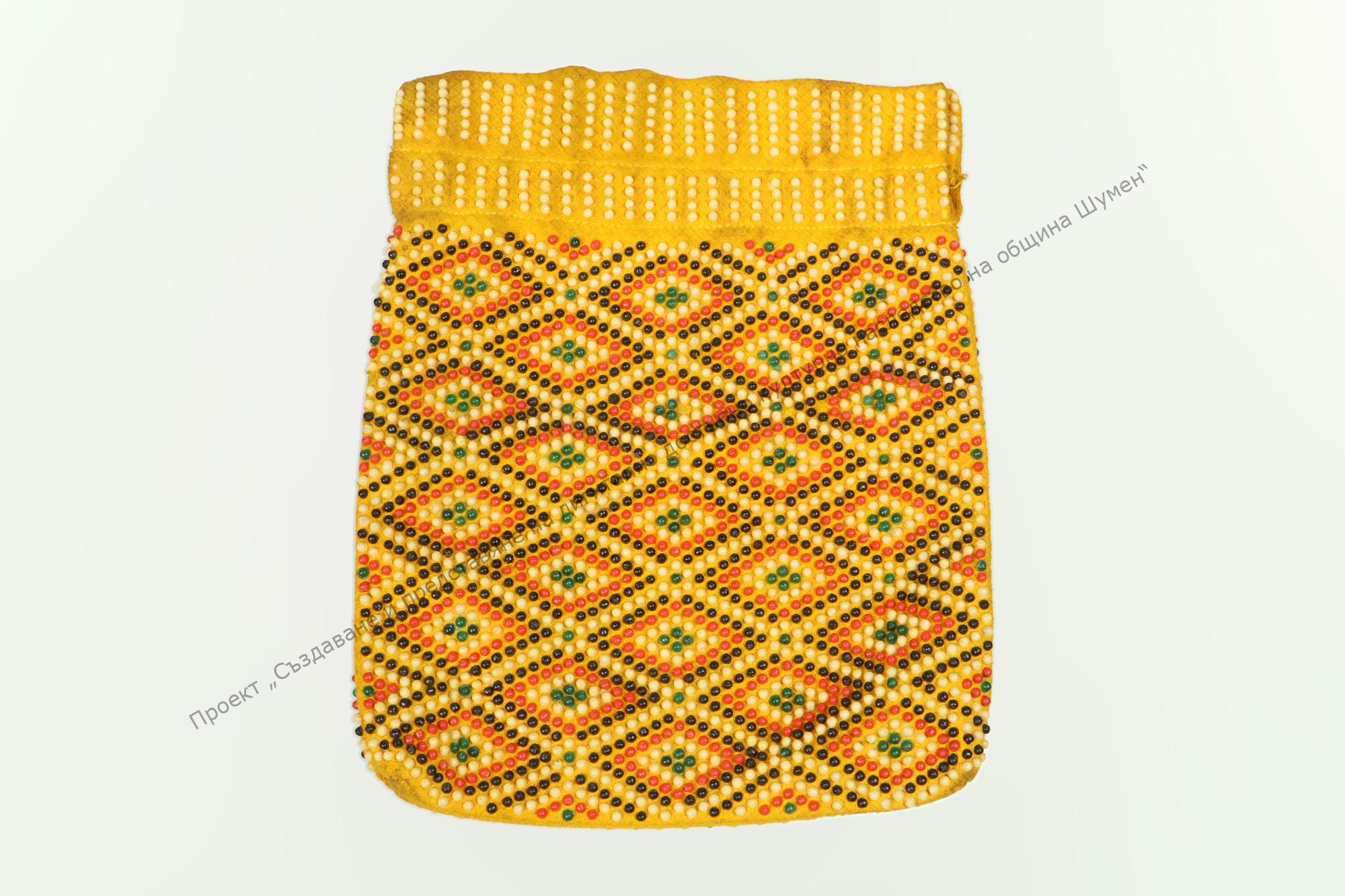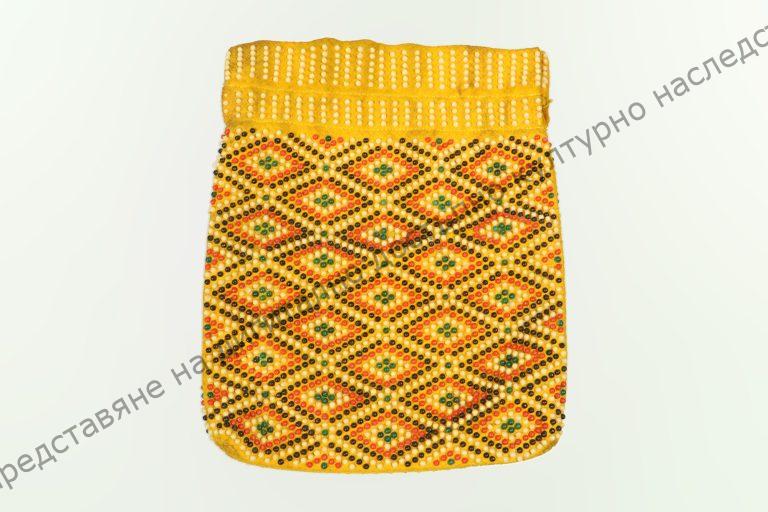 Of cotton fabric. Attached coloured beads forming rhomboid figures on the front, From the first half of the 20th century