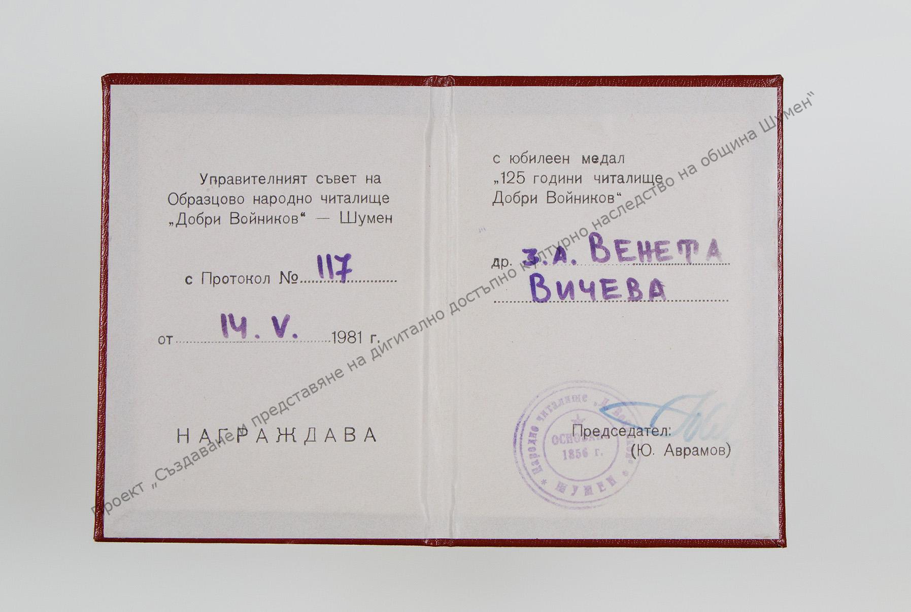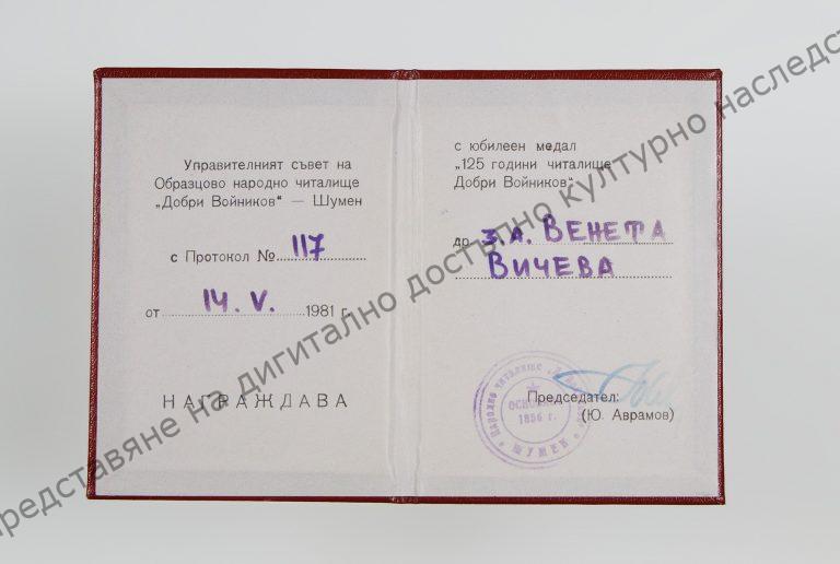 „125 years “Dobri Voynikov” Chitalishte, Shumen. Awarded to prof. Veneta Vicheva. “Musical Work” Collection