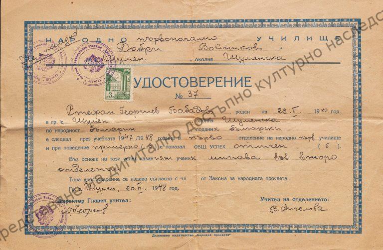 Issued to Stefan Georgiev Bobadov for completing first grade of “Dobri Voynikov” People’s Primary School, Shumen, 20th of June 1948