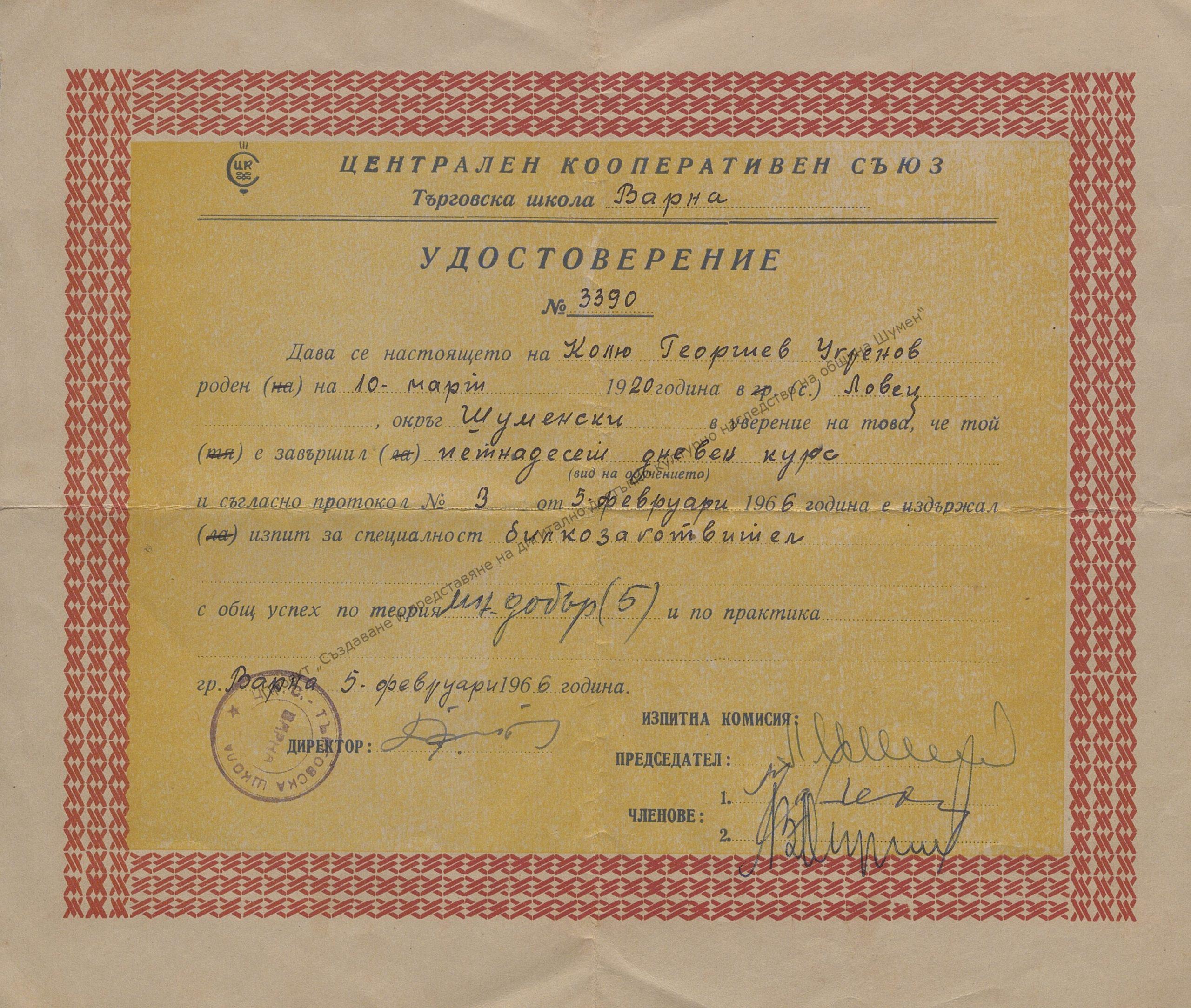 Issued to Kolyu Georgiev Ugrenov for completing 15-day herbal preparation course, 5th of February 1966. Commercial School – Varna