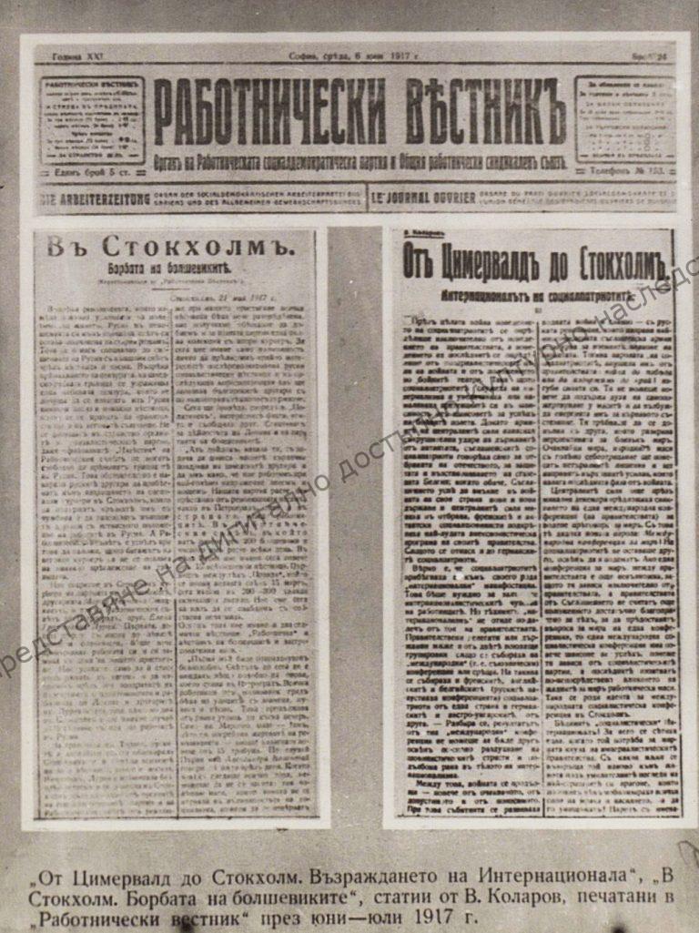 „От Цимервалд до Стокхолм. Възраждането на Интернационала. В Стокхолм. Борбата на болшевиките“ (From Zimmerwald to Stockholm. The revival of the International. In Stockholm. The struggle of the Bolsheviks) – articles of V. Kolarov printed in „Работнически вестник“ Newspaper in June-July 1917. “Vasil Kolarov” Collection