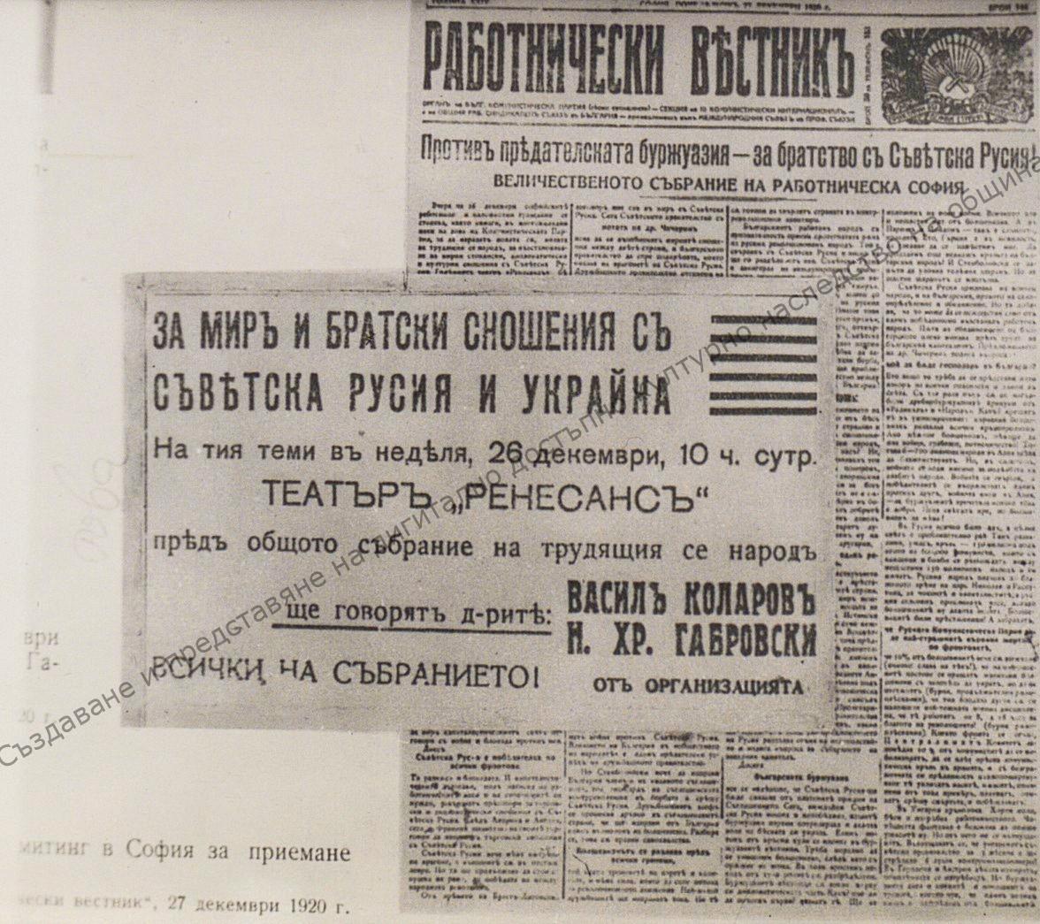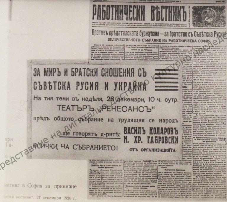 Announcement for a meeting in Sofia on the 26th of December 1920. „Работнически вестник“ Newspaper,24th of December 1920. “Vasil Kolarov” Collection