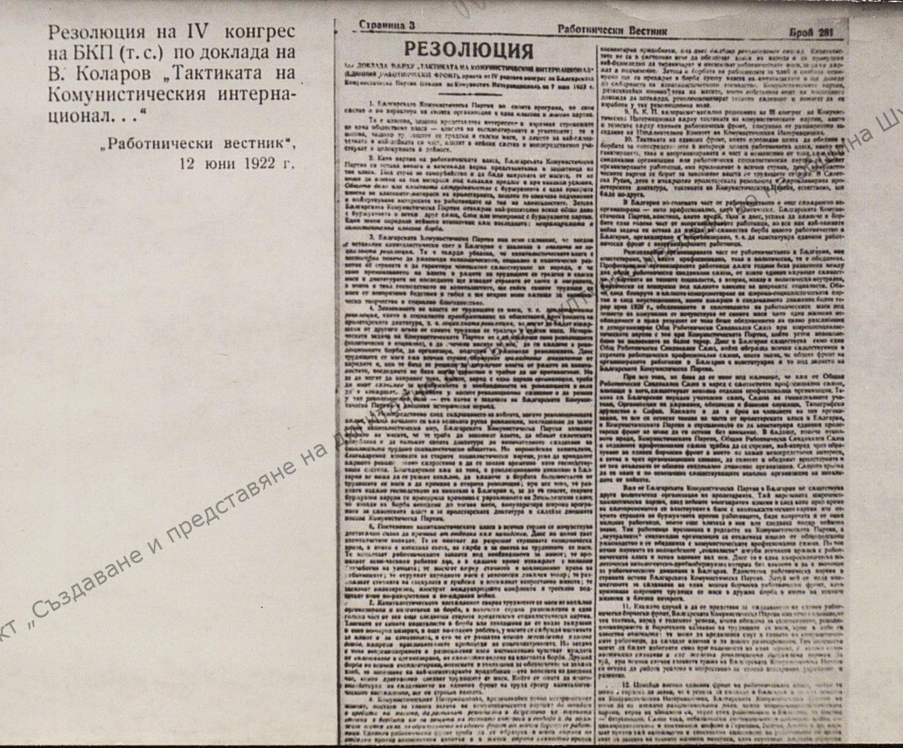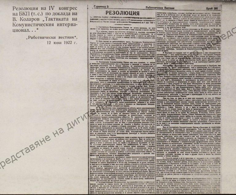 Resolution of the 4th Congress of the Bulgarian Communist Party on V. Kolarov’s report „Тактиката на комунистическия интернационал“ (Tactics of the Communist International), 12th of June 1922. “Vasil Kolarov” Collection