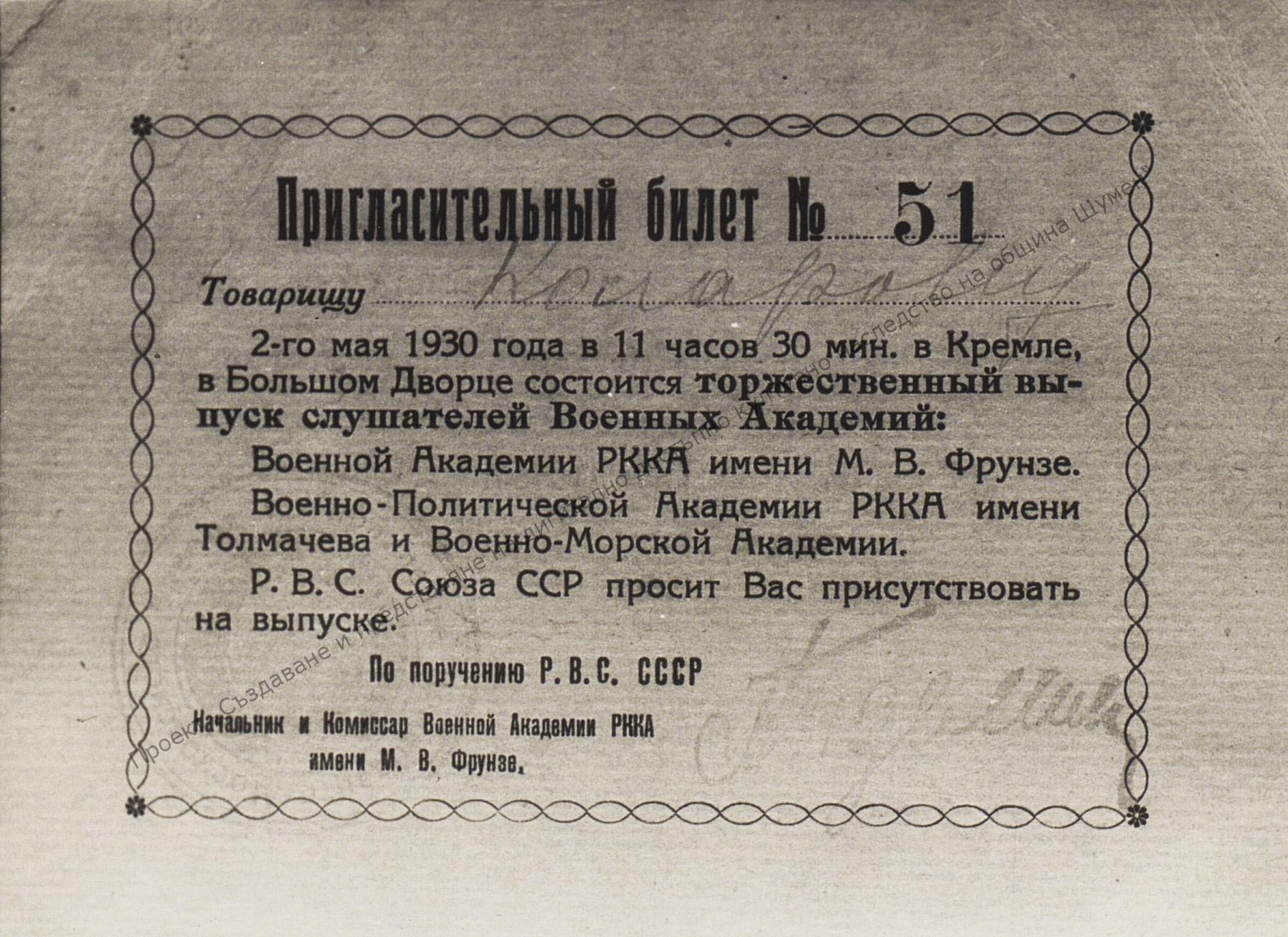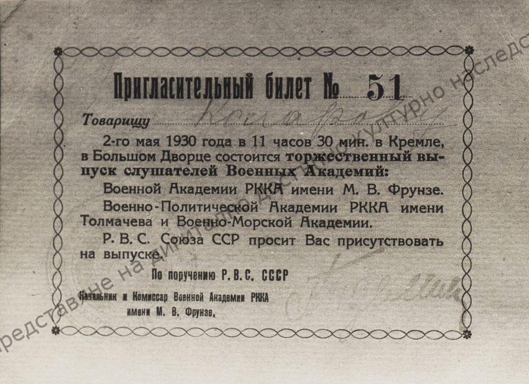 Invitation to V. Kolarov to attend in the Kremlin on the 2nd of May 1930