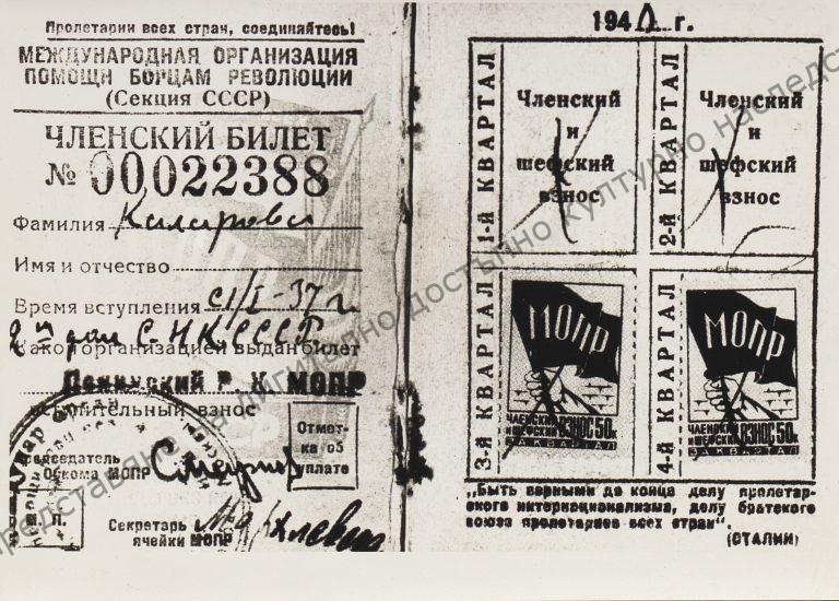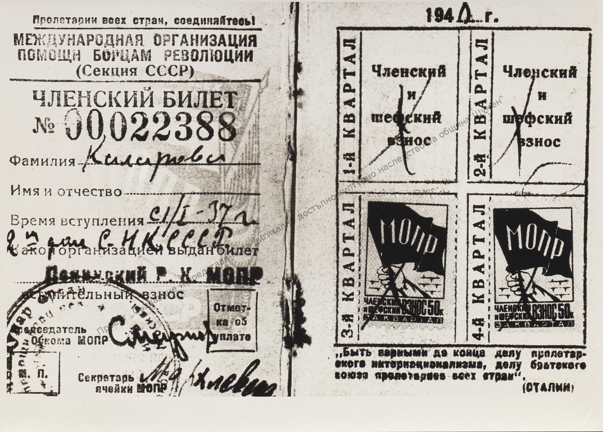 Vasil Kolarov’s International Red Aid membership card, 1937. “Vasil Kolarov” Collection