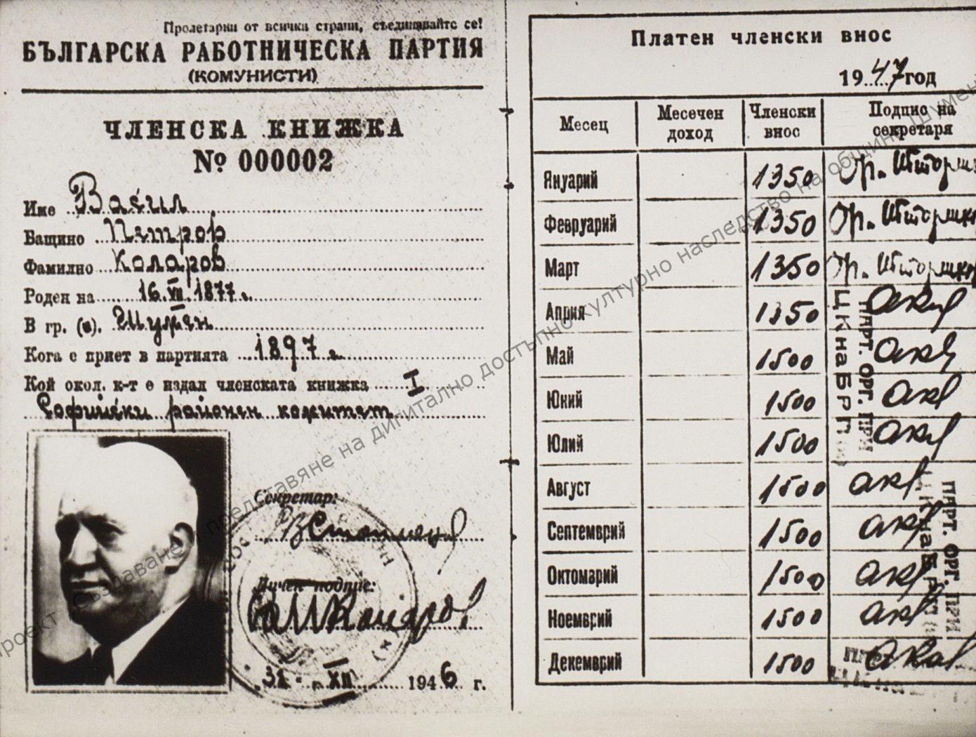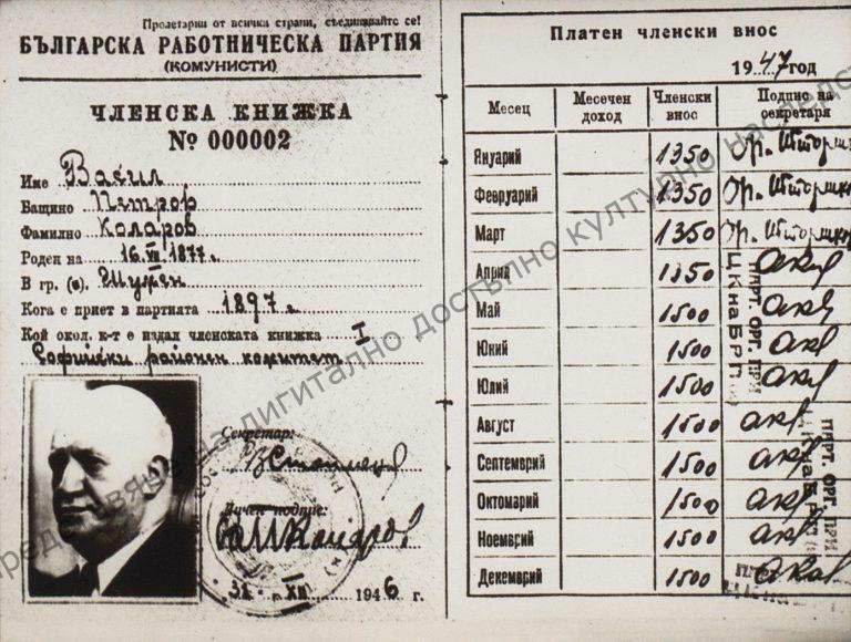 Kolarov’s Party membership card issued on the 31st of December 1946 “Vasil Kolarov” Collection