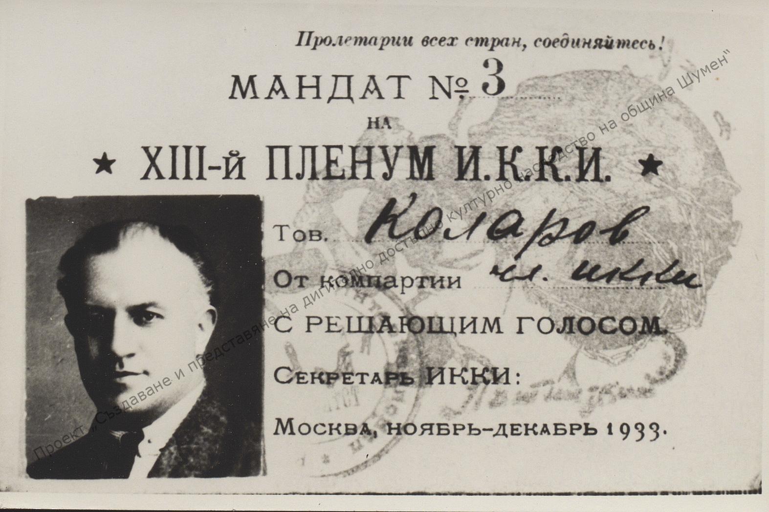 Mandate № 3 for the 13th Plenum of the Executive Committee of the Communist International of Vasil Kolarov