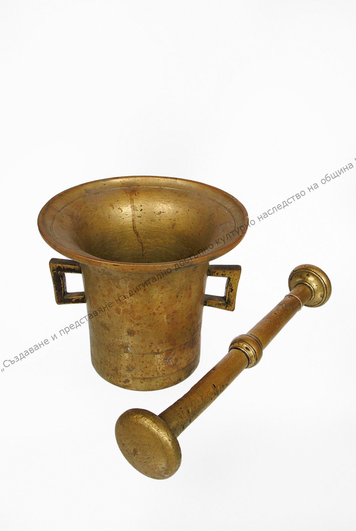 От жълт бронз. Употребявано в домакинството на Иванка Тодорова, през 20-те и 30-те години на XX век, в гр. Шумен