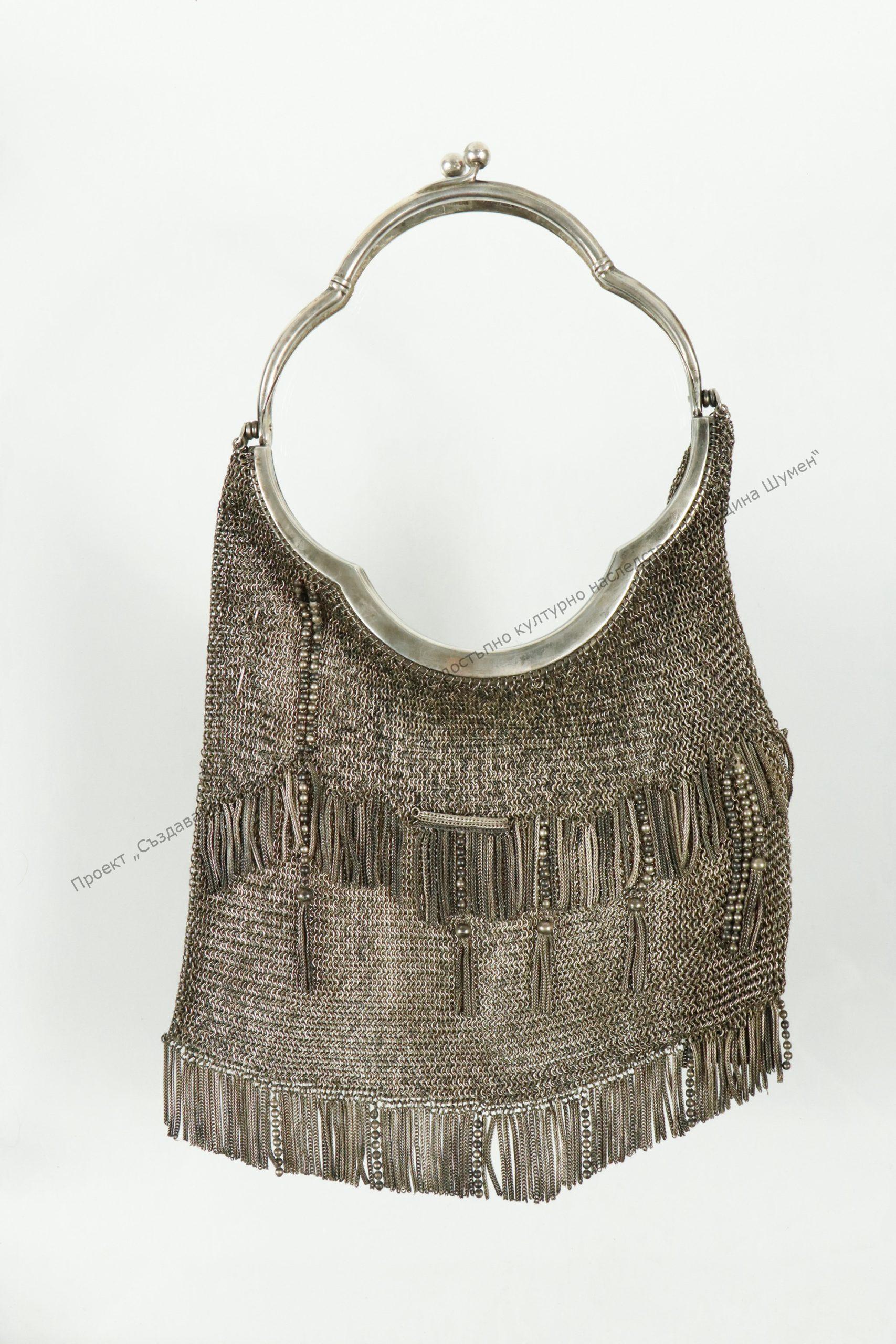 Of silver wire, chain mail knit. Decoration of thrums and beads