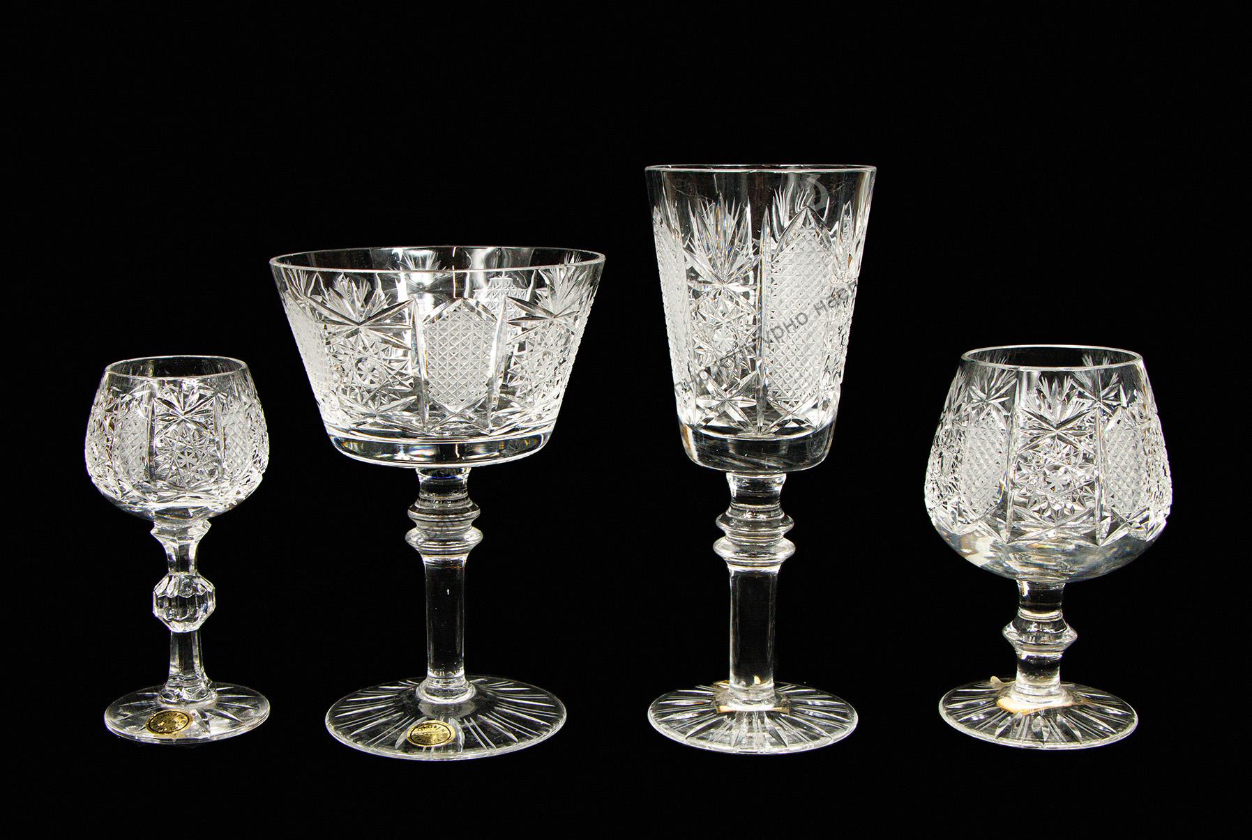 Серия чаши с различна форма и височина. Изработени от оловен кристал. Ръчна изработка на гравюрата.