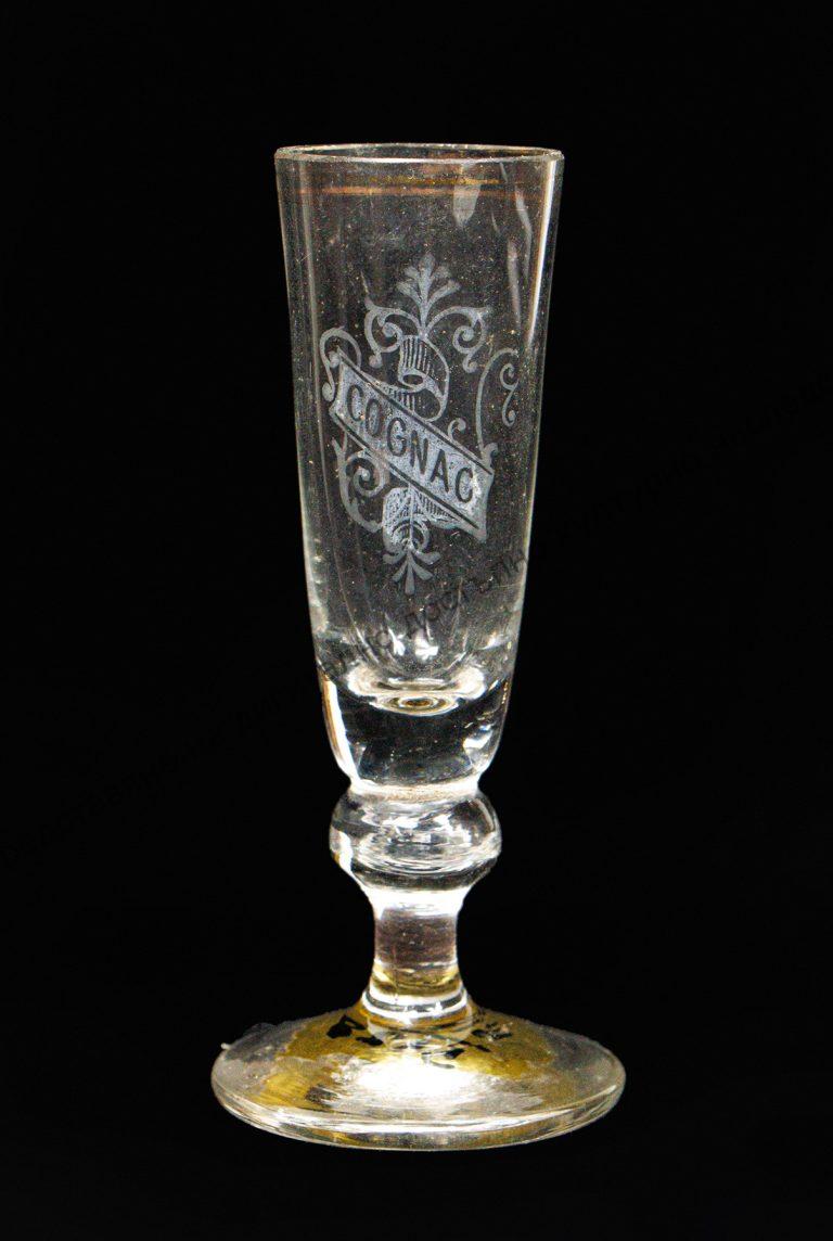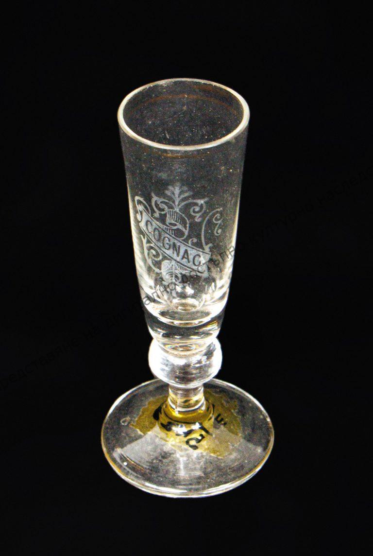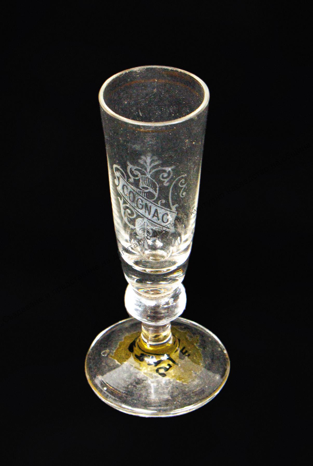 Изработена от прозрачно стъкло. С форма на пресечен конус. Украса от боя – растителна плетеница и надпис. Златен кант