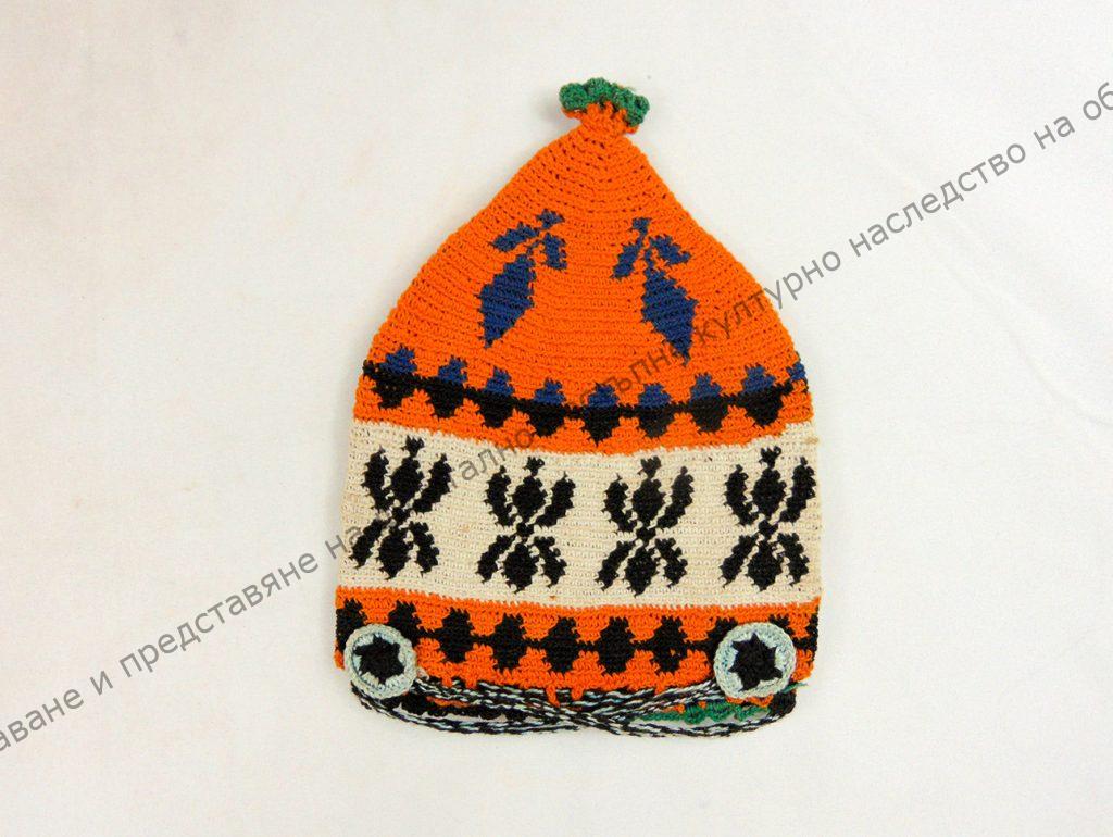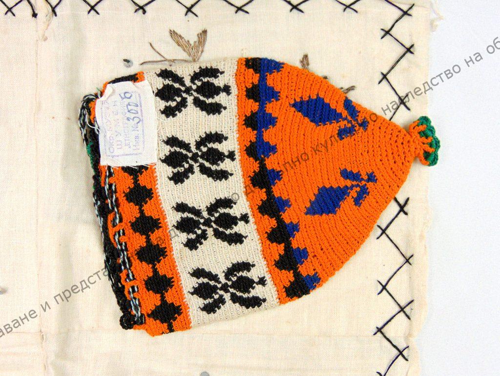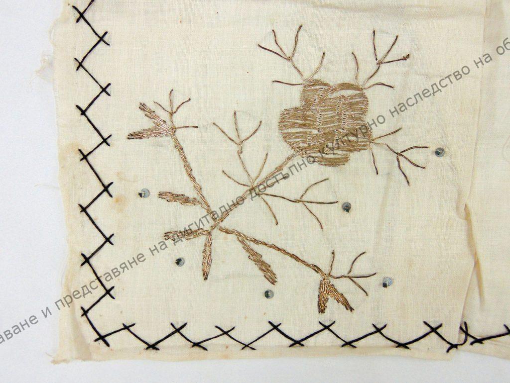 От бяло фабрично памучно платно. Сгънато и пришито. В центъра е пришита кесията. Тя е изплетена на една кука.