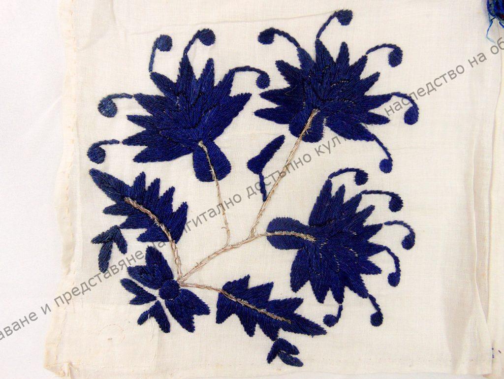 От бяло фабрично памучно платно. Сгънато и пришито. Изпълнена машинска бродерия.