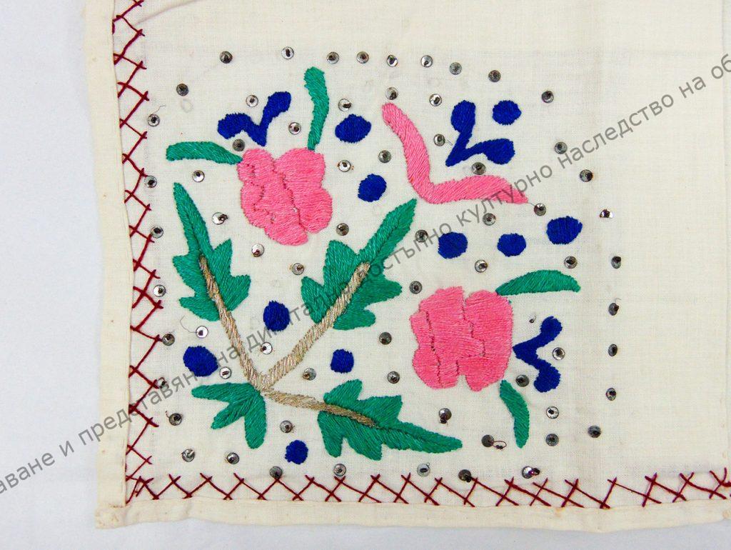 От бяло фабрично памучно платно. Сгънато и пришито. Изпълнена машинска бродерия с ленени конци.