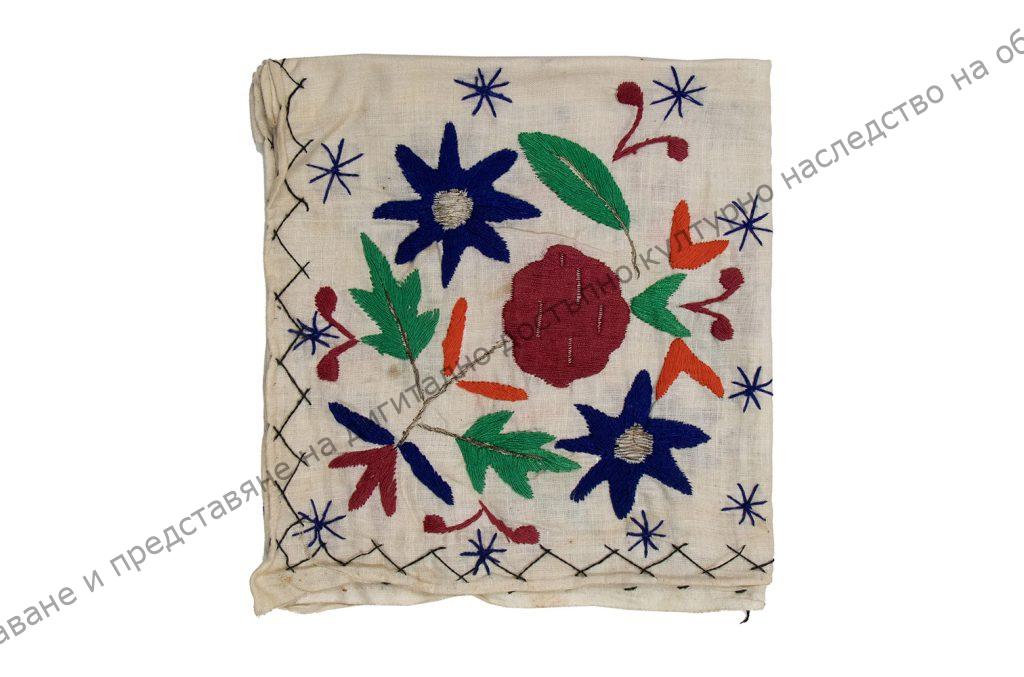 От бяло фабрично памучно платно. Сгънато и пришито. Изпълнена машинска бродерия.