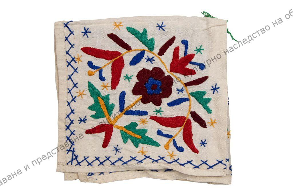 От бяло фабрично памучно платно. Сгънато и пришито. Изпълнена машинска бродерия от памучни конци.