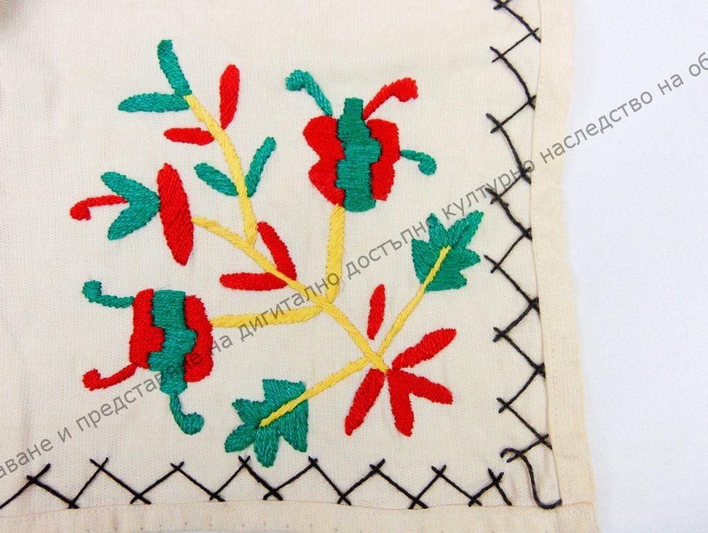 От бяло фабрично памучно платно. Сгънато и пришито. Пълнена бродерия от памучни конци.