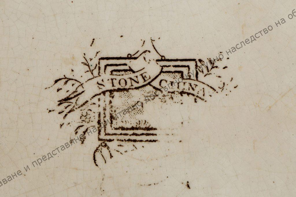 От порцелан. Фабрична изработка. С елипсовидна форма. Украсата е нанесена с кафява боя. Представлява китайски пейзаж с къщи, върби, мост, дървета и две птици в полет една срещу друга. Околните стени с плетеница от по-малки и по-едри ромбични фигури. Извитият навън ръб също е украсен с подобна плетеница. В нея са вплетени и растителни орнаменти. От долната страна на дъното има печат със същата боя – „STONE CLUNA“.