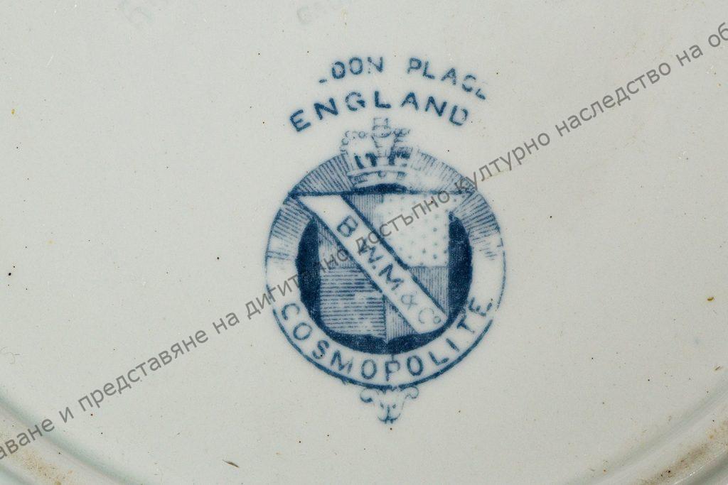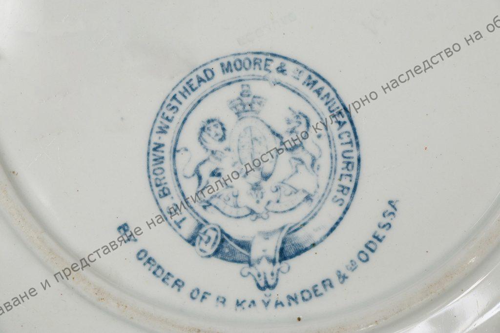 От бял порцелан. Фабрична изработка. Дъното е с два печата. Текстът на единият е „CAULDON PLACE ENGLAND“, „B.W.M. & Co“ è „COSMOPOLITAN“, а на другия – „T.C.BROWN – WESTHEAD MOORE &Co MANUFACTURERS“, под него „BY ORDER OF RKAYANDER & Co ODESSA“.