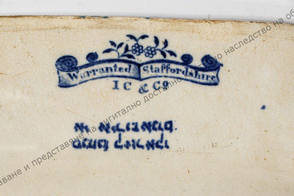 От бял порцелан, вносна. Върху бял фон украса в маслинено синьо, изпълнена в дребни квадратчета. Елипсовидна форма с периферия 5,2 см. Бордюр от кръгчета с точка в средата. По дъното сцена от ежедневието на Япония с пейзаж, наоколо бордюр от геометрични орнаменти. На обратната страна печат на фабриката.