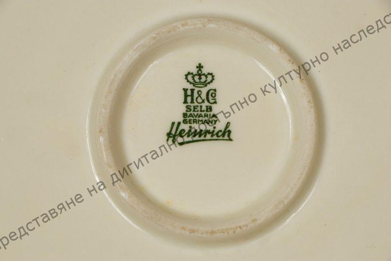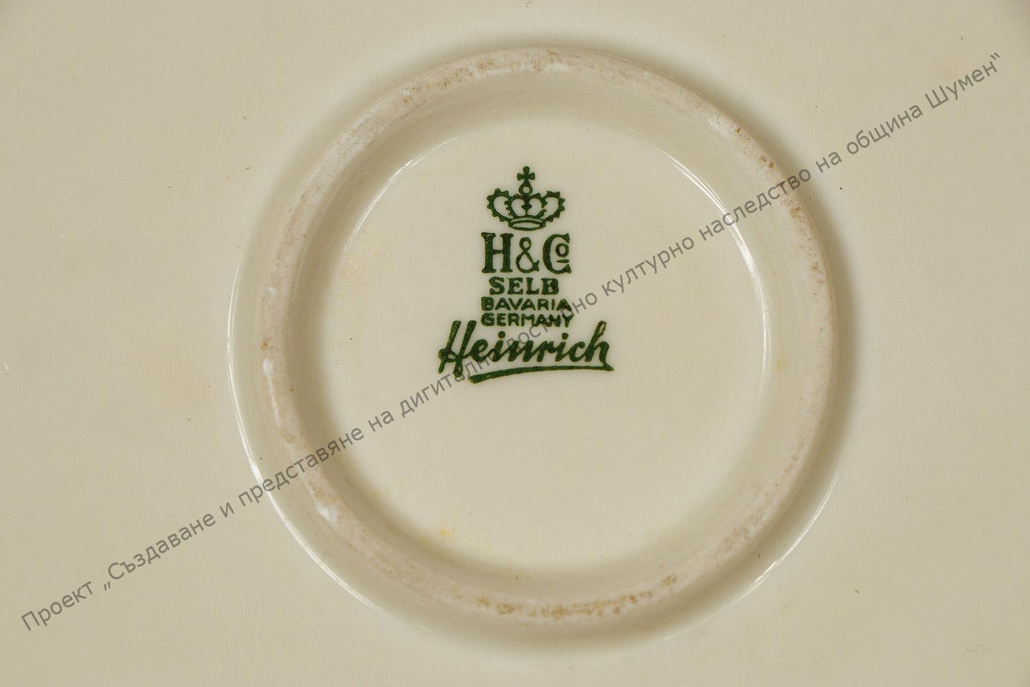 От порцелан. На дъното печат със зелена боя: корона, под нея „H & G“; „BAVARIA“; „GERMANY“; „Heinrich“