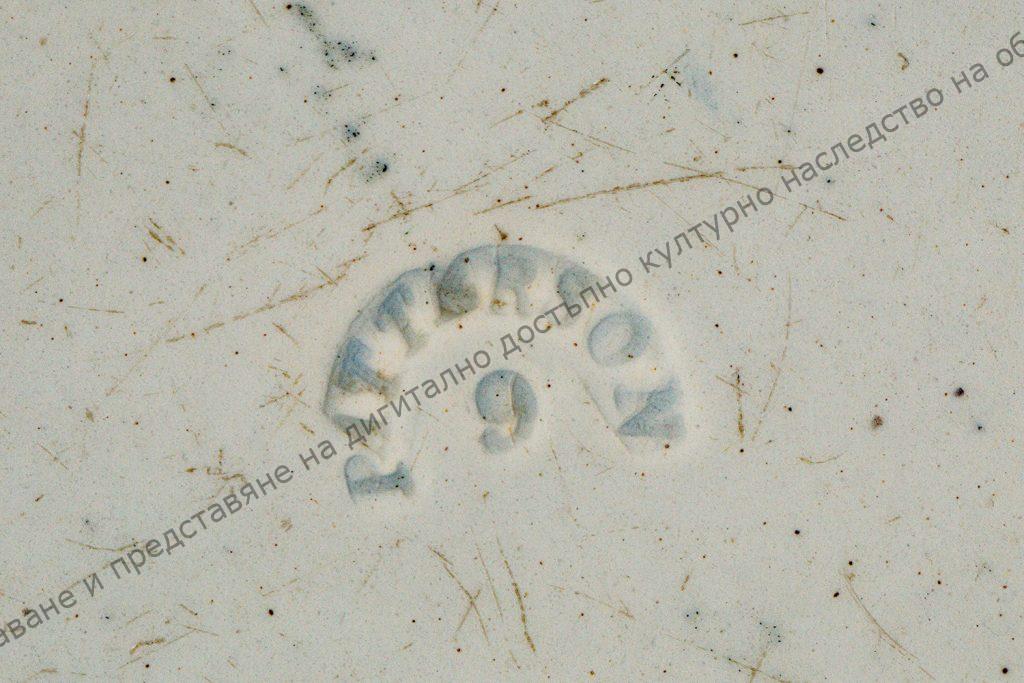 Чиния, вносна, фабрична. Има форма на елипса. От порцелан, рисувана с черен графит. Плитка, с периферна дължина 3,5 см, изпълнена с дребни квадратчета, с геометрични фигури и растителни орнаменти. В средата пейзаж в източен стил ( японски, китайски ). На обратната страна печат на фабриката. Използвана за украса, вместо ваза.