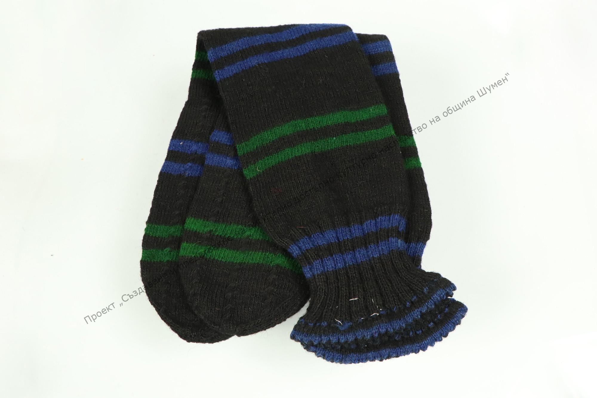 Мъжки, плетени на пет куки от вълнени домашно предени конци. Дълги до под колената. Плетени от Дечка Куртева от с. Марково първата половина на XX век