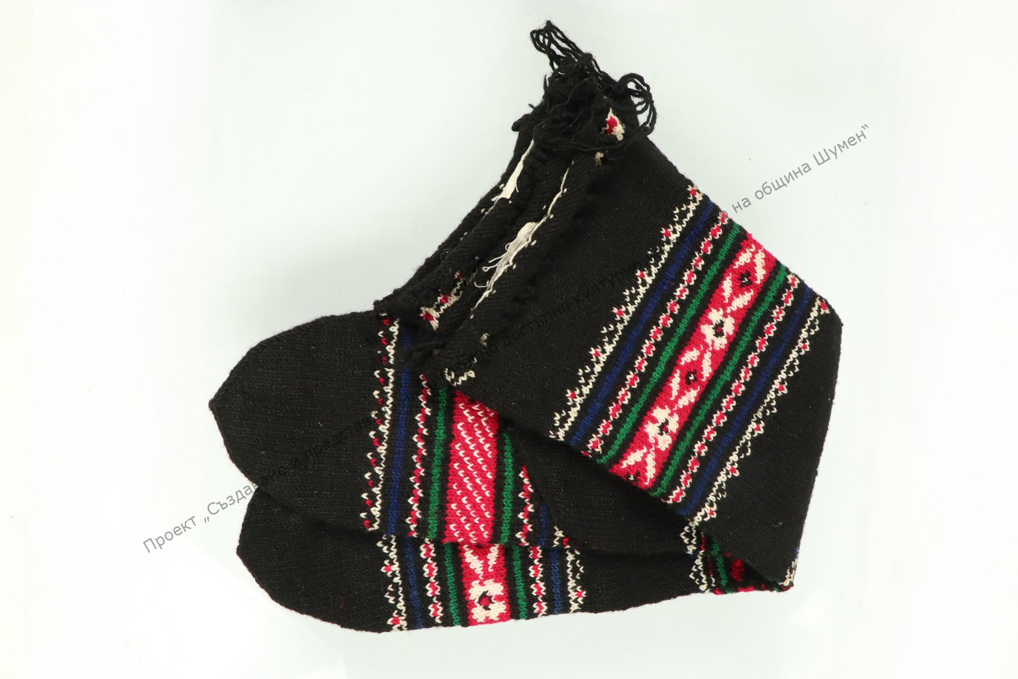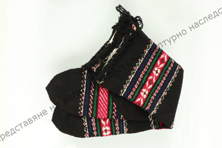 Мъжки. Изплетени на пет куки от домашна вълнена прежда с украса от разноцветни растителни орнаменти. Принадлежали на Марко Марков от с. Панайот Волов, учителствал в Македония, където са му подарени