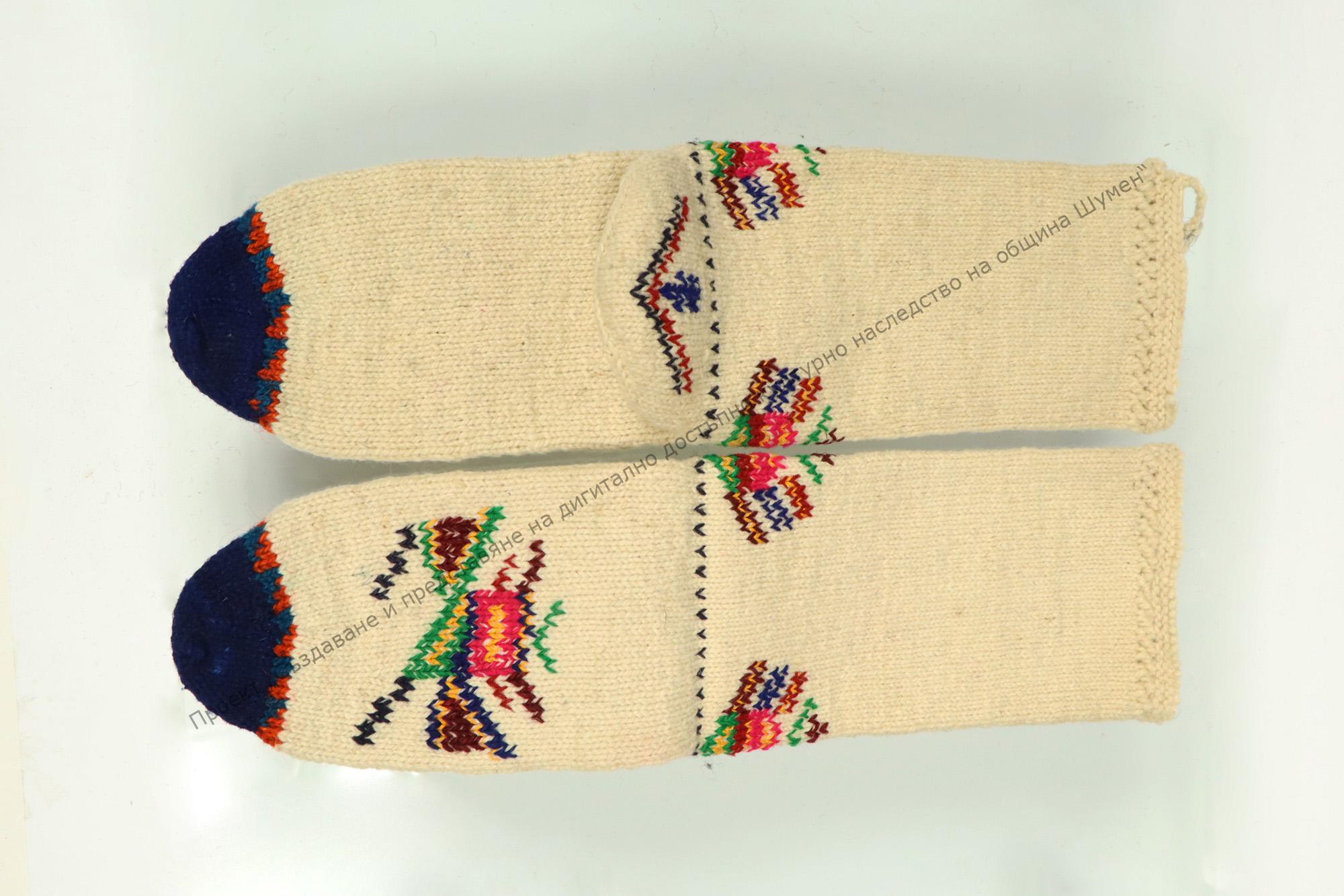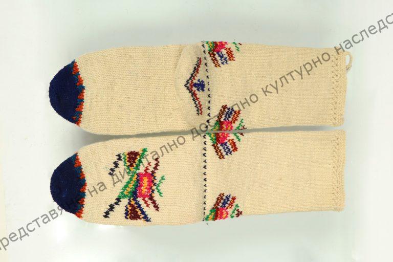От естествена вълнена прежда, с мотиви оформени от цветни ивици, в горния край ажурена плетка. Тип „помашки“