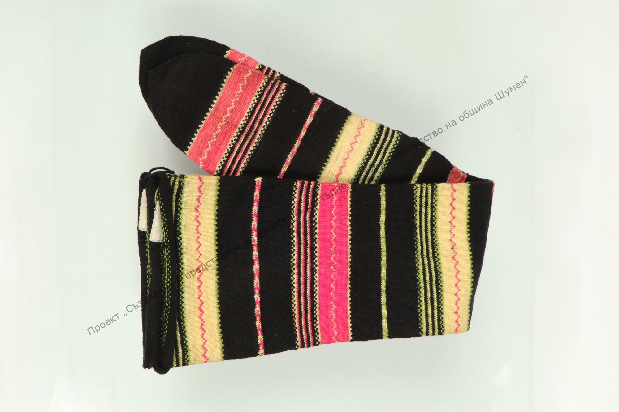 Плетени на пет куки от разноцветни памучни конци. Целите на хоризонтални райета. Дълги до коленете. Изработени около 1912-1915 г. в беломорието ор добруджански преселници