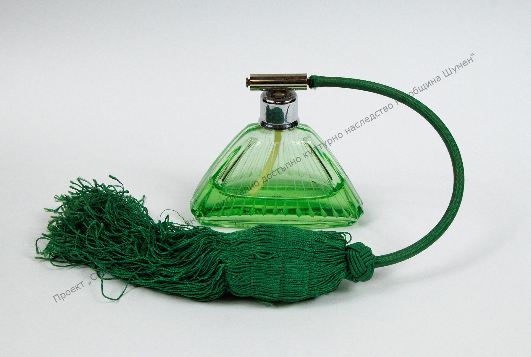 Изработено от зелено стъкло с трапецовидна форма. Врязана украса от линии.