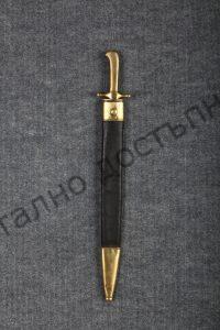 “Springfield”. The blade is double-edged, leaf-shaped, with three fullers of various length on both sides. The guard is of yellow metal, as well as the hilt. The scabbard is of thick black leather with metal locket and chape.