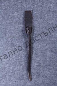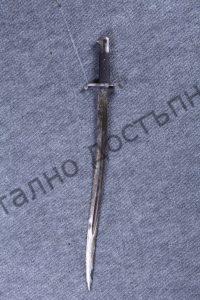 For “Snider” rifle. The blade is single-edged, scimitar-like, with a wide fuller on each side, tapering to the point. Iron cross guard with a bore for the muzzle. The grip is of black knurled material. The scabbard is of black leather with metal locket and chape.
