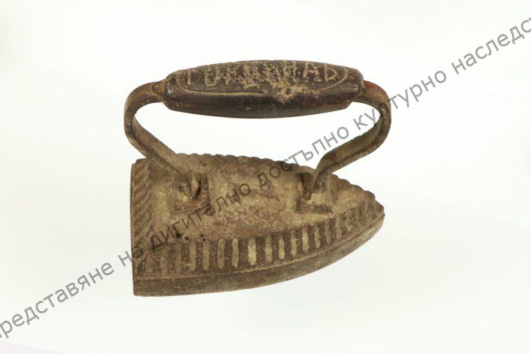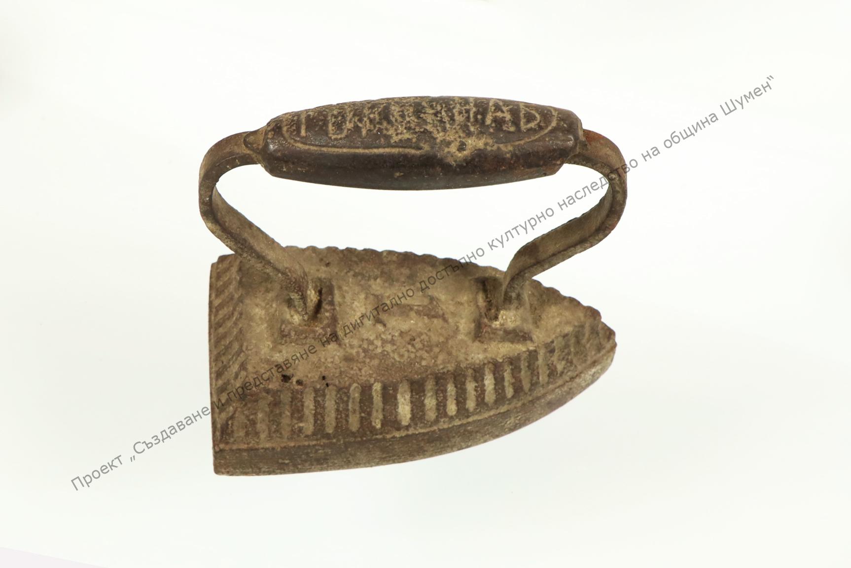 Iron, flat triangular pyramid shape. Decorated with parallel lines. Curved handle