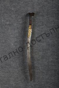 Iron blade, deeply curved to the inner cutting edge, partly hardened. The hilt plaques are of dark horn and spread out in two “ears” to either side, characeristic of the type. The scabbard is missing. Belonged to Vicho Popov from the village of Osmar, born circa 1860.