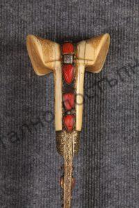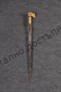 Iron blade, straight, with inner cutting edge, partly hardened. There are two narrow channels on both sides. The hilt plaques are of white bone and spread out in two “ears” to either side. The scabbard is of wood, covered with black leather.
