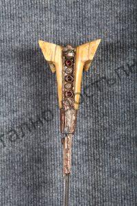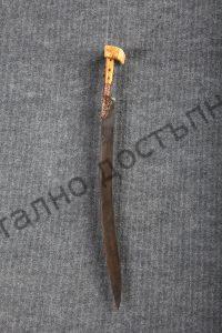 Iron blade, slightly curved to the inner cutting edge, partly hardened. There is one narrow channel on both sides. The hilt plaques are of white bone and spread out in two “ears” to either side, characteristic of the type. They are fastened to the blade with three rivets. The scabbard is missing.