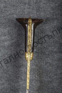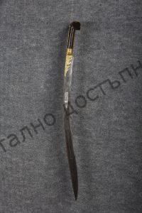 Iron blade, deeply curved to the inner cutting edge, partly hardened. The hilt plaques are of black bone and spread out in two “ears” to either side. The scabbard is missing.