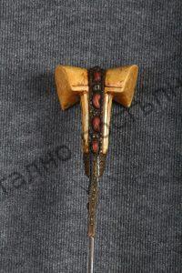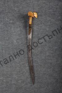 Iron blade, deeply curved to the inner cutting edge. There is one narrow channel on both sides. The hilt plaques are of white bone and spread out in two “ears” to either side. They are fastened to the blade with four rivets. The scabbard is missing.