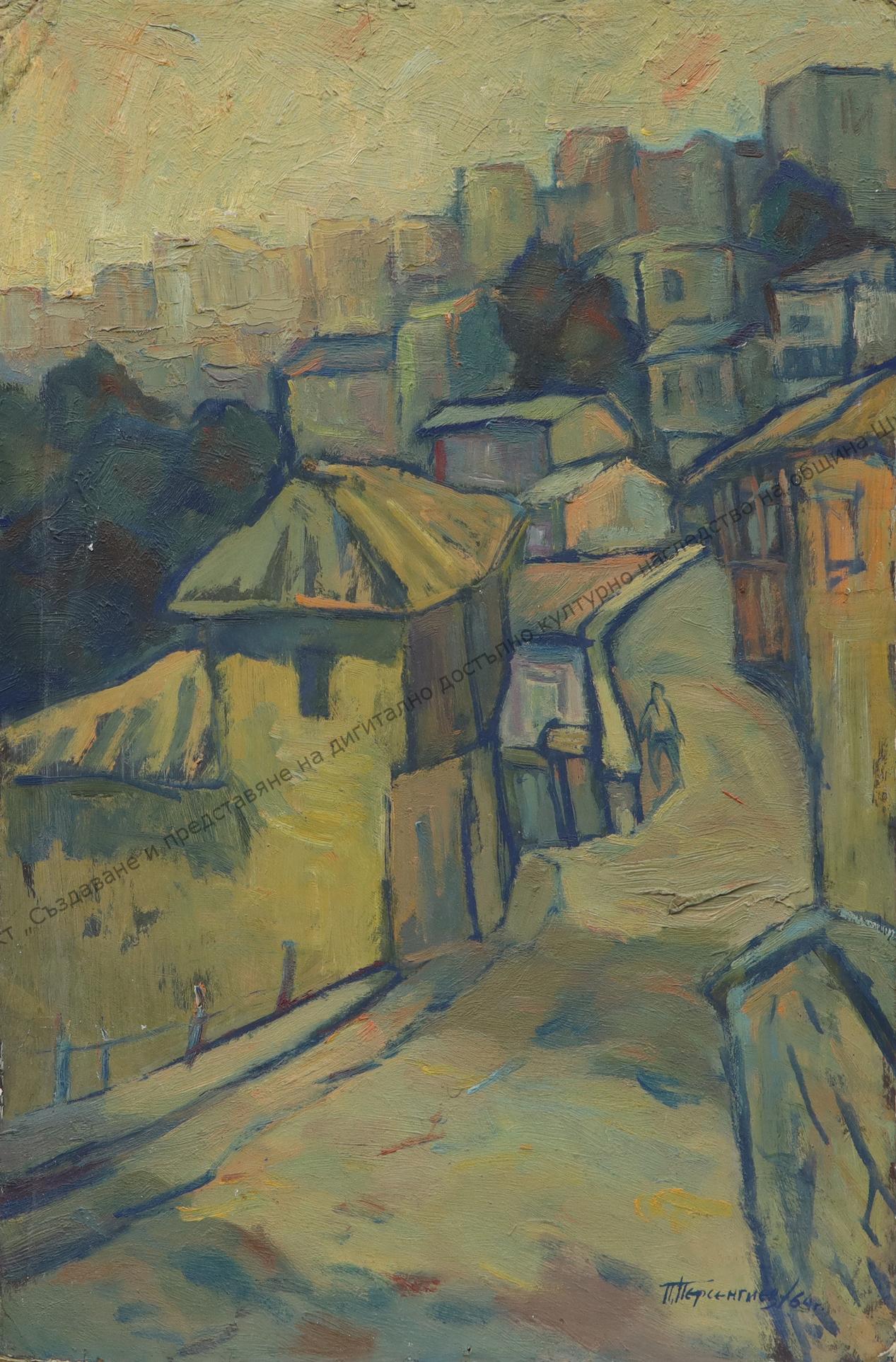 PERSENGIEV, Petar Stefanov Persengiev (PERSO) – (25.05.1933-26.12.1999). Born in Novi Pazar, Shumensko. Graduated from VTU “St. Cyril and Methodius” under Prof. V. Stoilov. Teacher at TFKS “Asen Zlatarov”. Founder of the art gallery in Novi Pazar. Member of the DSHH. Since 1960, he has participated in art exhibitions – national of the teacher-artists, district. He held 3 solo exhibitions at the “El. Karamihailova” gallery. He works in painting and graphics.