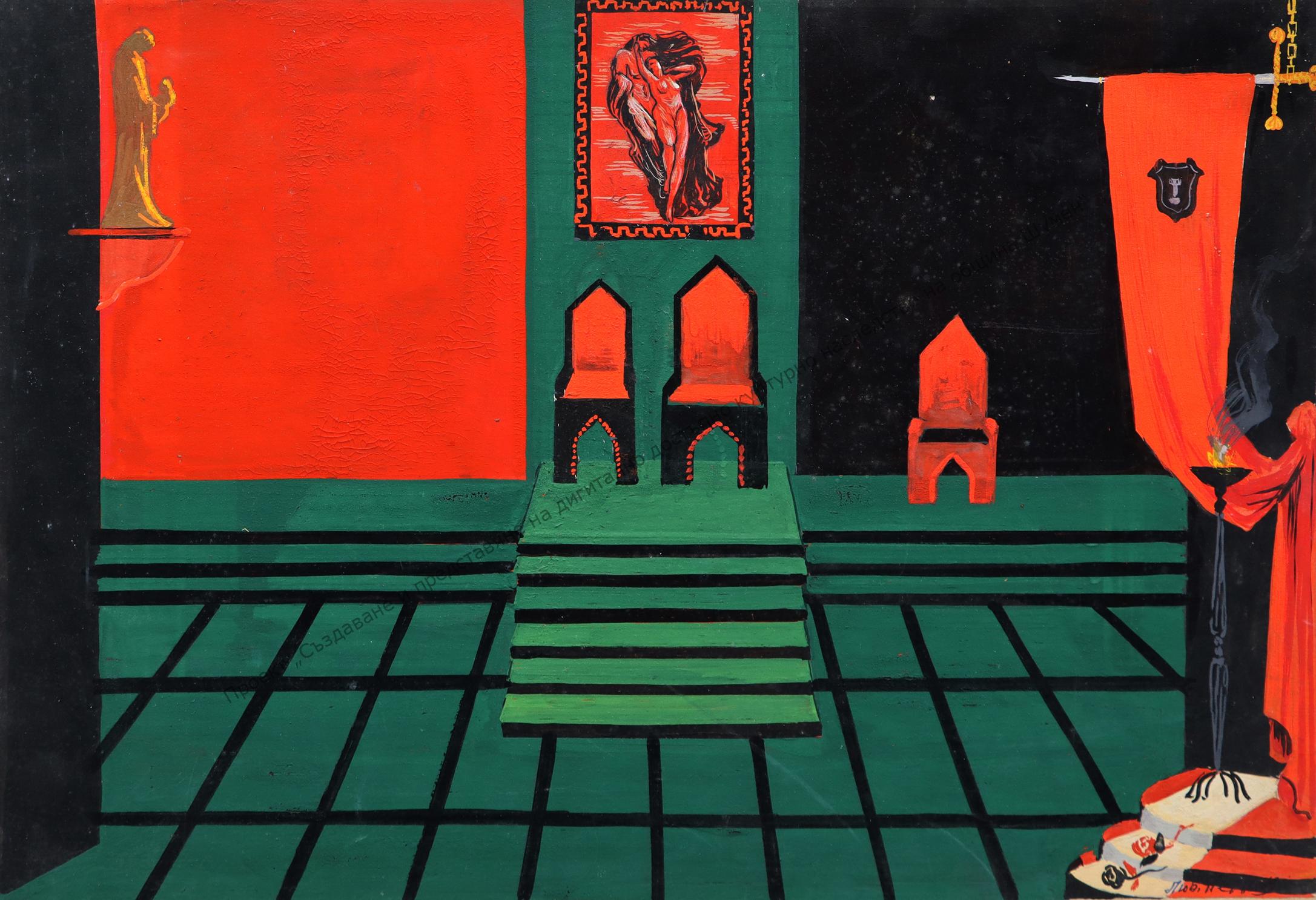 PETKOV, Lyubomir (Lyuben) Kalev Petkov (DYAD KAYU) -(30.XI.1915-1997). Born in Shumen. He graduated from the Art Academy (1937-1940) under Prof. N. Kozhuharov. Participated in the Patriotic War. Since 1946, he has been an artist at the “V. Drumev” Drama Theater – Shumen. Member of the Group of Shumen artists. Honored figure of DOSO – member of the Shumen Aero Club. Holder of the Order “Cyril and Methodius” – Third degree.
