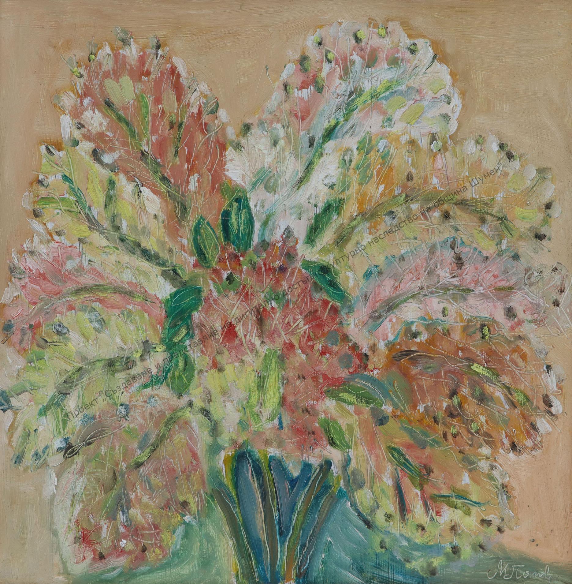 PAPAZOVA, Milka Dimitrova Papazova (7.X.1930 – 30.12. 2017 Shumen) Born in the village of Batak, V. Tarnovsko. He graduated from the Institute for Junior High School Teachers with a major in drawing. Long-time drawing teacher and methodist. Member of the Group of Shumen artists. Since 1979, he has actively participated in local and national exhibitions of the teacher-artists, in exhibitions of the Shumen artists, and has held many solo exhibitions. Works in the field of painting and decorative technique “batik”. Author of the teaching aid “Mosaic, batik, souvenirs” – published by NI “Narodna Prosveta”, 1987 in a team with R. Racheva and Z. Karazapryanova. In 2005, she was awarded a silver badge by the Municipality of Shumen for her creative and teaching activities.